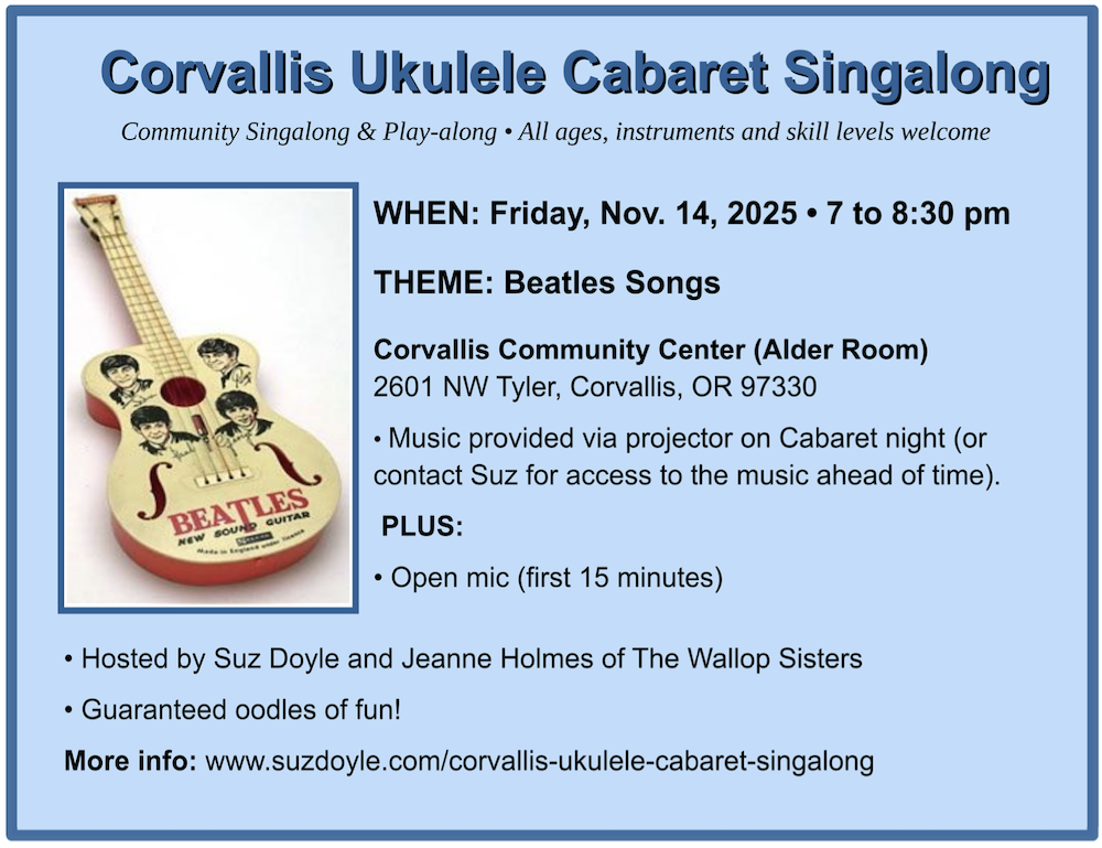 She co-hosts the monthly Corvallis Ukulele Cabaret community Singalongs, and above all, loves how music brings people together in connection, community, and joy.