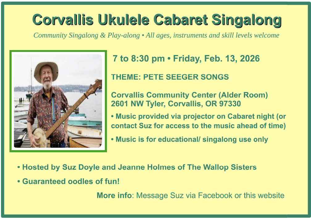 We are very grateful to the Corvallis Community Center for giving us a place to enjoy ukulele fun. And much gratitude to First Alternative Food Coop for having let us use their meeting room for our monthly uke singalongs for many years before that!