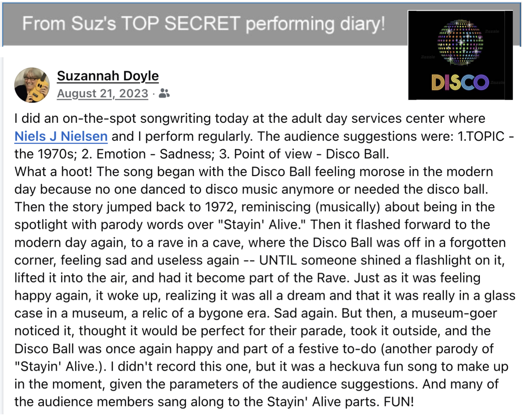 Suz specializes in making up songs on the fly, based on audience suggestions. Here are a few examples: